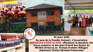 Et voilà qu’au mois de mars 2022, le Groupe Scolaire Bilingue Espérance Divine prévenu de l’arrivée à Douala du Grand Barakuda, la Fondatrice, Mme Rosette IVAHA, organise une magnifique cérémonie pour l’accueil de ce nécessaire scolaire. Il faut dire qu’elle a depuis eu le temps de faire aménager exprès des rayons supplémentaires dans la bibliothèque de l’école, et que la salle d’éveil, elle aussi, est fin prête!